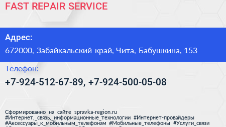 FAST REPAIR SERVICE по адресу 672000, Забайкальский край, Чита, Бабушкина, 153 в дальнейшем Организация, размещена в следующих категориях: