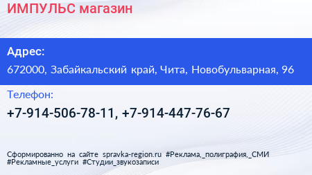 ИМПУЛЬС, магазин по адресу 672000, Забайкальский край, Чита, Новобульварная, 96 в дальнейшем Организация, размещена в следующих категориях: