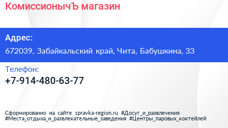 КомиссионычЪ, магазин по адресу 672039, Забайкальский край, Чита, Бабушкина, 33 в дальнейшем Организация, размещена в следующих категориях:
