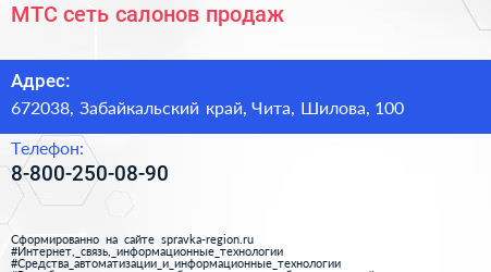 МТС, сеть салонов продаж по адресу 672038, Забайкальский край, Чита, Шилова, 100 в дальнейшем Организация, размещена в следующих категориях: