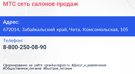 МТС, сеть салонов продаж по адресу 672014, Забайкальский край, Чита, Комсомольская, 105 в дальнейшем Организация, размещена в следующих категориях: