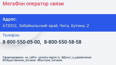 МегаФон, оператор связи по адресу 672012, Забайкальский край, Чита, Бутина, 2 в дальнейшем Организация, размещена в следующих категориях: