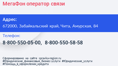 МегаФон, оператор связи по адресу 672000, Забайкальский край, Чита, Амурская, 84 в дальнейшем Организация, размещена в следующих категориях: