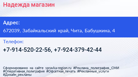 Надежда, магазин по адресу 672039, Забайкальский край, Чита, Бабушкина, 4 в дальнейшем Организация, размещена в следующих категориях: