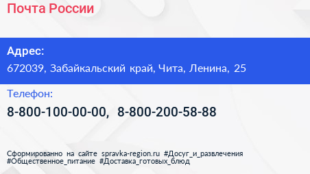 Почта России по адресу 672039, Забайкальский край, Чита, Ленина, 25 в дальнейшем Организация, размещена в следующих категориях:
