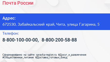 Почта России по адресу 672530, Забайкальский край, Чита, улица Гагарина, 5 в дальнейшем Организация, размещена в следующих категориях: