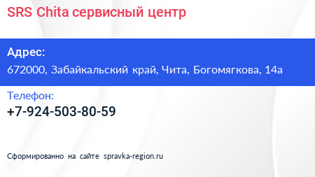 SRS Chita, сервисный центр по адресу 672000, Забайкальский край, Чита, Богомягкова, 14а в дальнейшем Организация, размещена в следующих категориях: