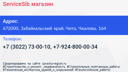 ServiceSib, магазин по адресу 672000, Забайкальский край, Чита, Чкалова, 164 в дальнейшем Организация, размещена в следующих категориях: