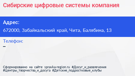 Сибирские цифровые системы, компания по адресу 672000, Забайкальский край, Чита, Балябина, 13 в дальнейшем Организация, размещена в следующих категориях: