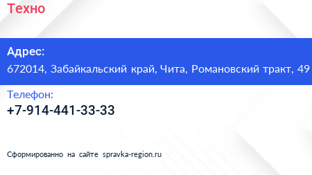 Техно по адресу 672014, Забайкальский край, Чита, Романовский тракт, 49 в дальнейшем Организация, размещена в следующих категориях: