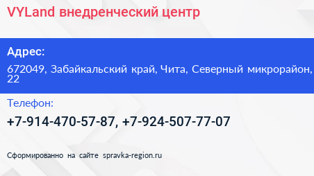 VYLand, внедренческий центр по адресу 672049, Забайкальский край, Чита, Северный микрорайон, 22 в дальнейшем Организация, размещена в следующих категориях: