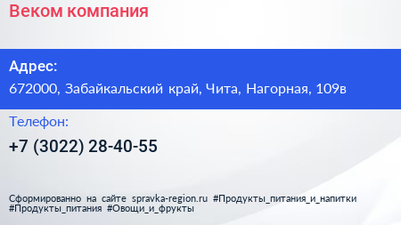 Веком, компания по адресу 672000, Забайкальский край, Чита, Нагорная, 109в в дальнейшем Организация, размещена в следующих категориях: