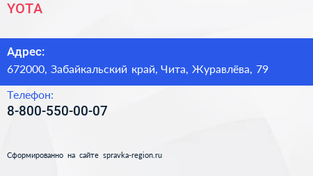 YOTA по адресу 672000, Забайкальский край, Чита, Журавлёва, 79 в дальнейшем Организация, размещена в следующих категориях: