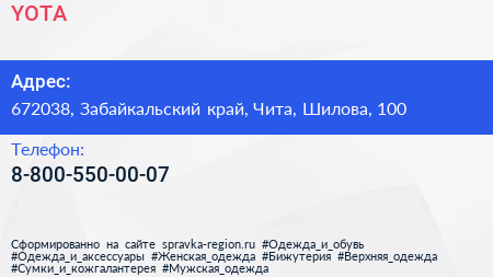 YOTA по адресу 672038, Забайкальский край, Чита, Шилова, 100 в дальнейшем Организация, размещена в следующих категориях: