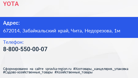 YOTA по адресу 672014, Забайкальский край, Чита, Недорезова, 1м в дальнейшем Организация, размещена в следующих категориях: