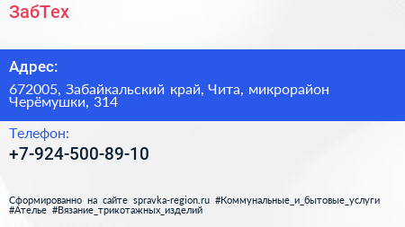 ЗабТех по адресу 672005, Забайкальский край, Чита, микрорайон Черёмушки, 314 в дальнейшем Организация, размещена в следующих категориях: