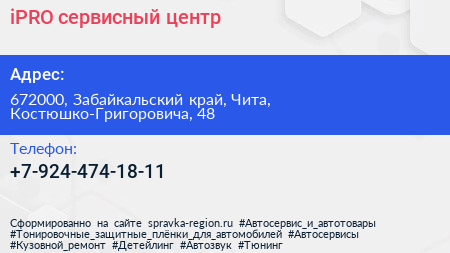 iPRO, сервисный центр по адресу 672000, Забайкальский край, Чита, Костюшко-Григоровича, 48 в дальнейшем Организация, размещена в следующих категориях: