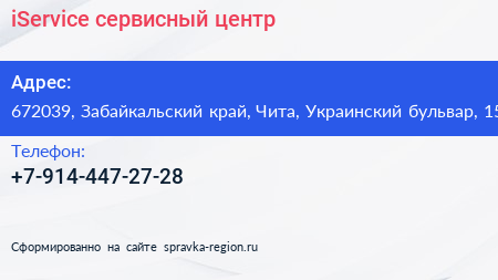 iService, сервисный центр по адресу 672039, Забайкальский край, Чита, Украинский бульвар, 15 в дальнейшем Организация, размещена в следующих категориях: