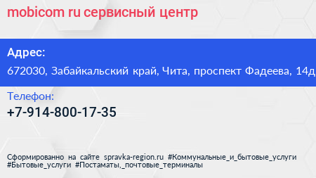mobicom.ru, сервисный центр по адресу 672030, Забайкальский край, Чита, проспект Фадеева, 14д в дальнейшем Организация, размещена в следующих категориях: