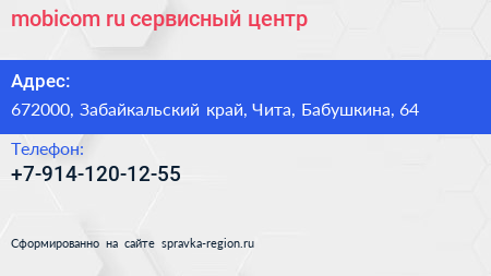 mobicom.ru, сервисный центр по адресу 672000, Забайкальский край, Чита, Бабушкина, 64 в дальнейшем Организация, размещена в следующих категориях: