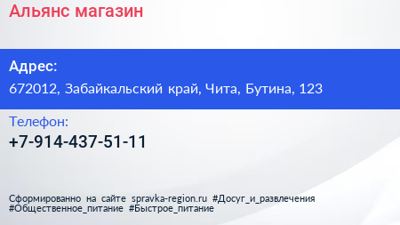 Альянс, магазин по адресу 672012, Забайкальский край, Чита, Бутина, 123 в дальнейшем Организация, размещена в следующих категориях: