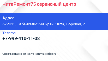 ЧитаРемонт75, сервисный центр по адресу 672015, Забайкальский край, Чита, Боровая, 2 в дальнейшем Организация, размещена в следующих категориях:
