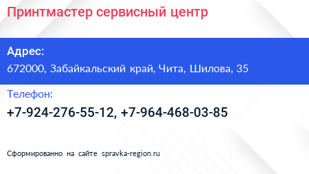 Принтмастер, сервисный центр по адресу 672000, Забайкальский край, Чита, Шилова, 35 в дальнейшем Организация, размещена в следующих категориях: