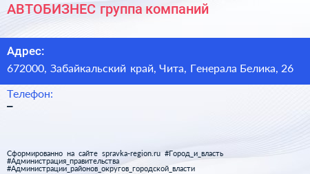 АВТОБИЗНЕС, группа компаний по адресу 672000, Забайкальский край, Чита, Генерала Белика, 26 в дальнейшем Организация, размещена в следующих категориях: