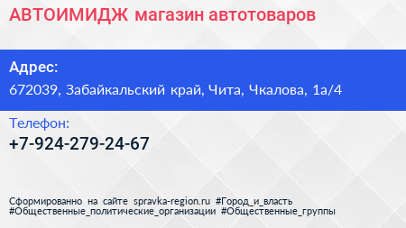 АВТОИМИДЖ, магазин автотоваров по адресу 672039, Забайкальский край, Чита, Чкалова, 1а/4 в дальнейшем Организация, размещена в следующих категориях: