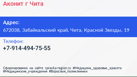 Аконит, г. Чита по адресу 672038, Забайкальский край, Чита, Красной Звезды, 19 в дальнейшем Организация, размещена в следующих категориях: