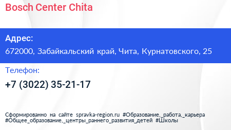 Bosch Center Chita по адресу 672000, Забайкальский край, Чита, Курнатовского, 25 в дальнейшем Организация, размещена в следующих категориях: