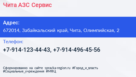 Чита АЗС Сервис по адресу 672014, Забайкальский край, Чита, Олимпийская, 2 в дальнейшем Организация, размещена в следующих категориях: