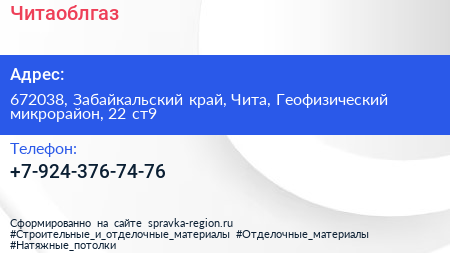 Читаоблгаз по адресу 672038, Забайкальский край, Чита, Геофизический микрорайон, 22 ст9 в дальнейшем Организация, размещена в следующих категориях: