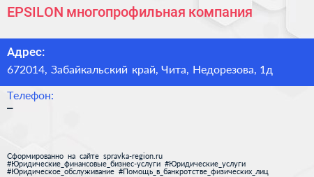 EPSILON, многопрофильная компания по адресу 672014, Забайкальский край, Чита, Недорезова, 1д в дальнейшем Организация, размещена в следующих категориях: