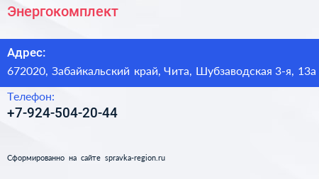 Энергокомплект по адресу 672020, Забайкальский край, Чита, Шубзаводская 3-я, 13а в дальнейшем Организация, размещена в следующих категориях: