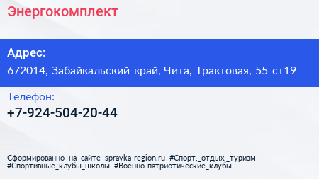 Энергокомплект по адресу 672014, Забайкальский край, Чита, Трактовая, 55 ст19 в дальнейшем Организация, размещена в следующих категориях: