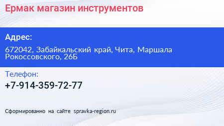 Ермак, магазин инструментов по адресу 672042, Забайкальский край, Чита, Маршала Рокоссовского, 26Б в дальнейшем Организация, размещена в следующих категориях: