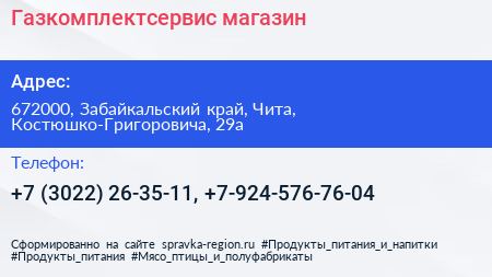 Газкомплектсервис, магазин по адресу 672000, Забайкальский край, Чита, Костюшко-Григоровича, 29а в дальнейшем Организация, размещена в следующих категориях:
