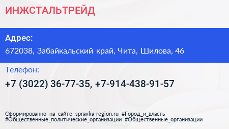 ИНЖСТАЛЬТРЕЙД по адресу 672038, Забайкальский край, Чита, Шилова, 46 в дальнейшем Организация, размещена в следующих категориях:
