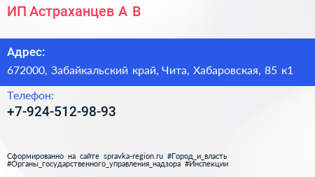 ИП Астраханцев А.В. по адресу 672000, Забайкальский край, Чита, Хабаровская, 85 к1 в дальнейшем Организация, размещена в следующих категориях: