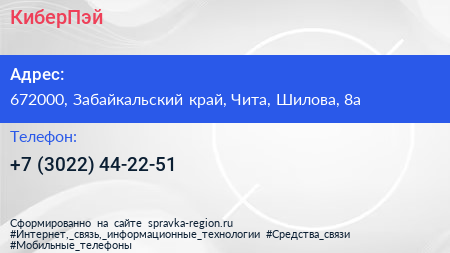 КиберПэй по адресу 672000, Забайкальский край, Чита, Шилова, 8а в дальнейшем Организация, размещена в следующих категориях: