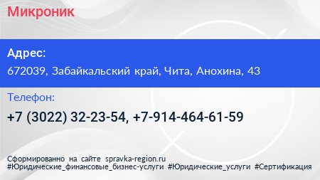 Микроник по адресу 672039, Забайкальский край, Чита, Анохина, 43 в дальнейшем Организация, размещена в следующих категориях: