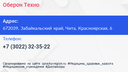 Оберон-Техно по адресу 672039, Забайкальский край, Чита, Красноярская, 6 в дальнейшем Организация, размещена в следующих категориях: