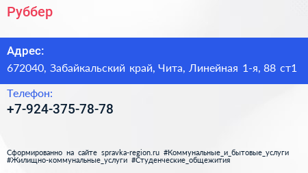 Руббер по адресу 672040, Забайкальский край, Чита, Линейная 1-я, 88 ст1 в дальнейшем Организация, размещена в следующих категориях: