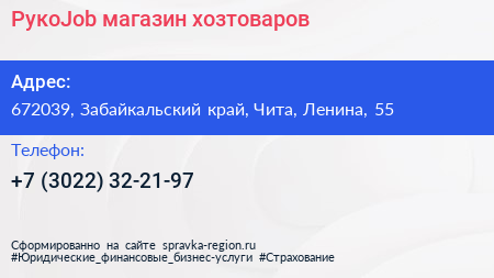 РукоJob, магазин хозтоваров по адресу 672039, Забайкальский край, Чита, Ленина, 55 в дальнейшем Организация, размещена в следующих категориях: