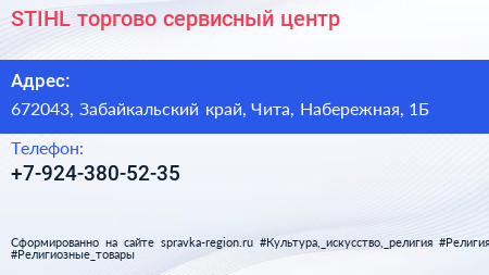 STIHL, торгово-сервисный центр по адресу 672043, Забайкальский край, Чита, Набережная, 1Б в дальнейшем Организация, размещена в следующих категориях: