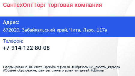СантехОптТорг, торговая компания по адресу 672020, Забайкальский край, Чита, Лазо, 117а в дальнейшем Организация, размещена в следующих категориях: