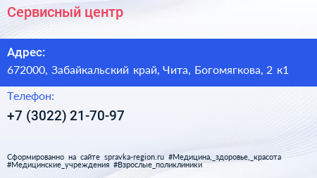 Сервисный центр по адресу 672000, Забайкальский край, Чита, Богомягкова, 2 к1 в дальнейшем Организация, размещена в следующих категориях:
