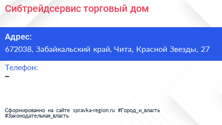 Сибтрейдсервис, торговый дом по адресу 672038, Забайкальский край, Чита, Красной Звезды, 27 в дальнейшем Организация, размещена в следующих категориях: