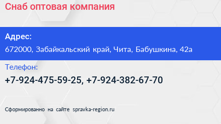 Снаб, оптовая компания по адресу 672000, Забайкальский край, Чита, Бабушкина, 42а в дальнейшем Организация, размещена в следующих категориях: